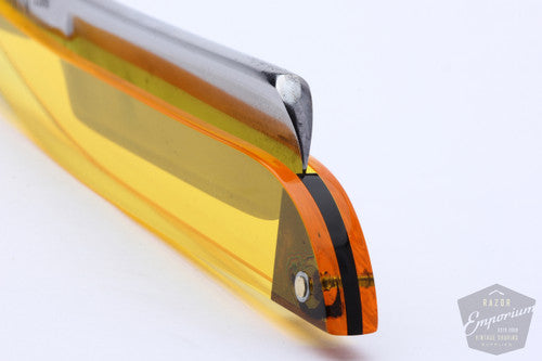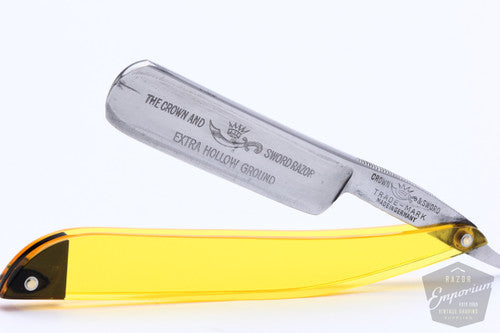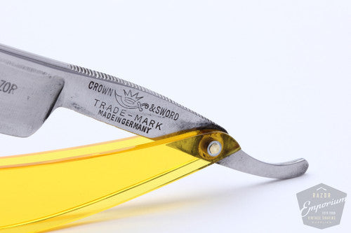 Available is an enormous 13/16" Straight Razor with unique yellow acryllic scales. Razor originates from Solignen, Germany and at its widest width is almost an entire inch! This blade is ground with a round point tip, making it a forgiving shaver, perfect for a beginner! This is a unique blade that will provide smooth shaves for years to come! Definitely worth a try if you are looking to add some variety to your shave den or looking for a large hefty straight razor that will be able to plow through the thickest beard!
