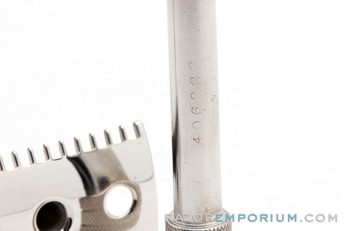 A beautiful razor from 1905 featuring open comb guard and balanced handle. The standard set was produced for the man who wanted to shave themselves and aided in Gillette's cause of making shaving accessible away from the barbershop and convenient for businessmen. Teeth are straight and ready to shave. Original silver plating requires constant upkeep so we upgraded the finish with superior Rhodium! Rhodium shines just as bright and white and will never tarnish. Super durable, aggressive shaver, this set has been cleaned and sanitized.