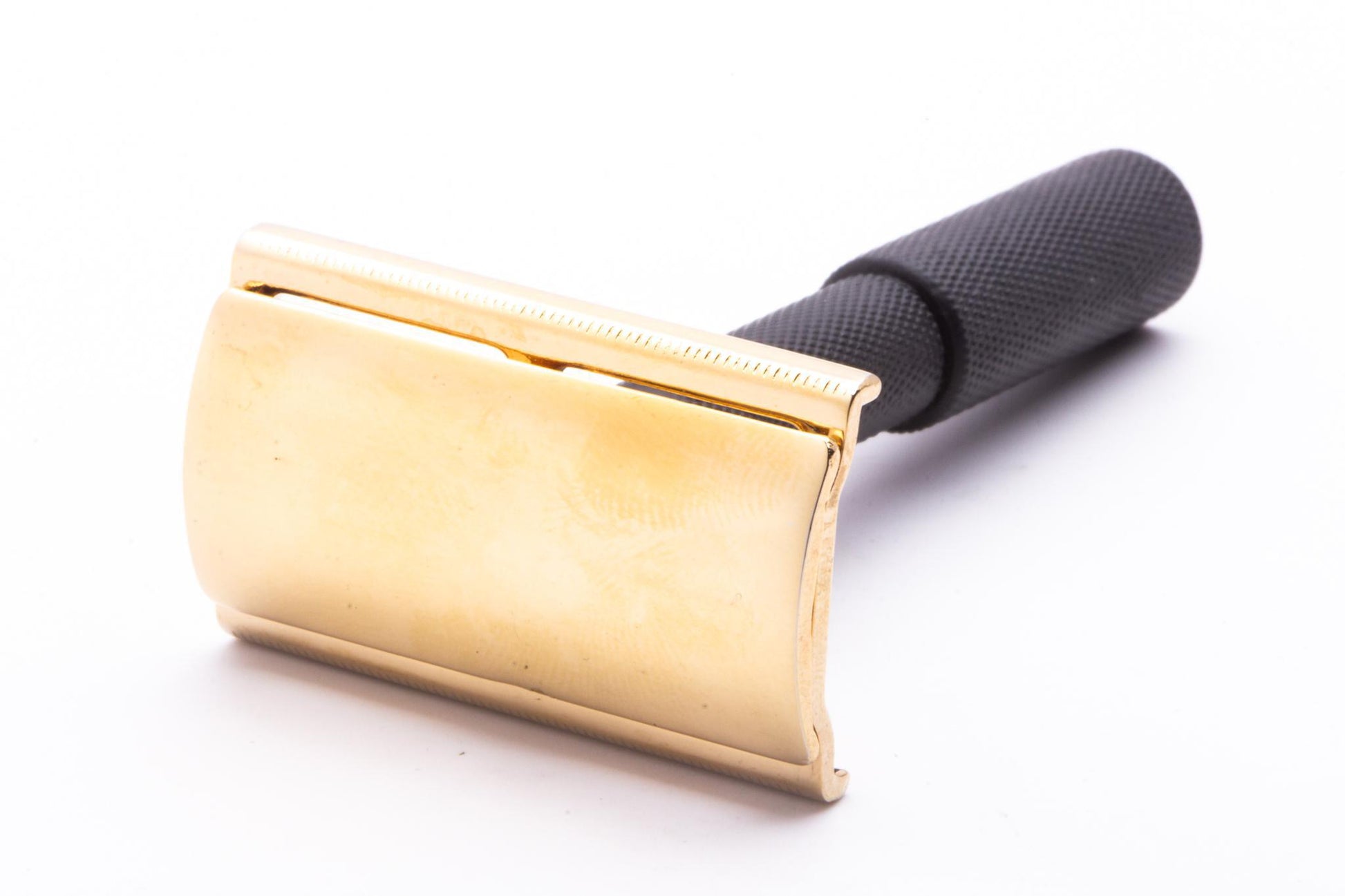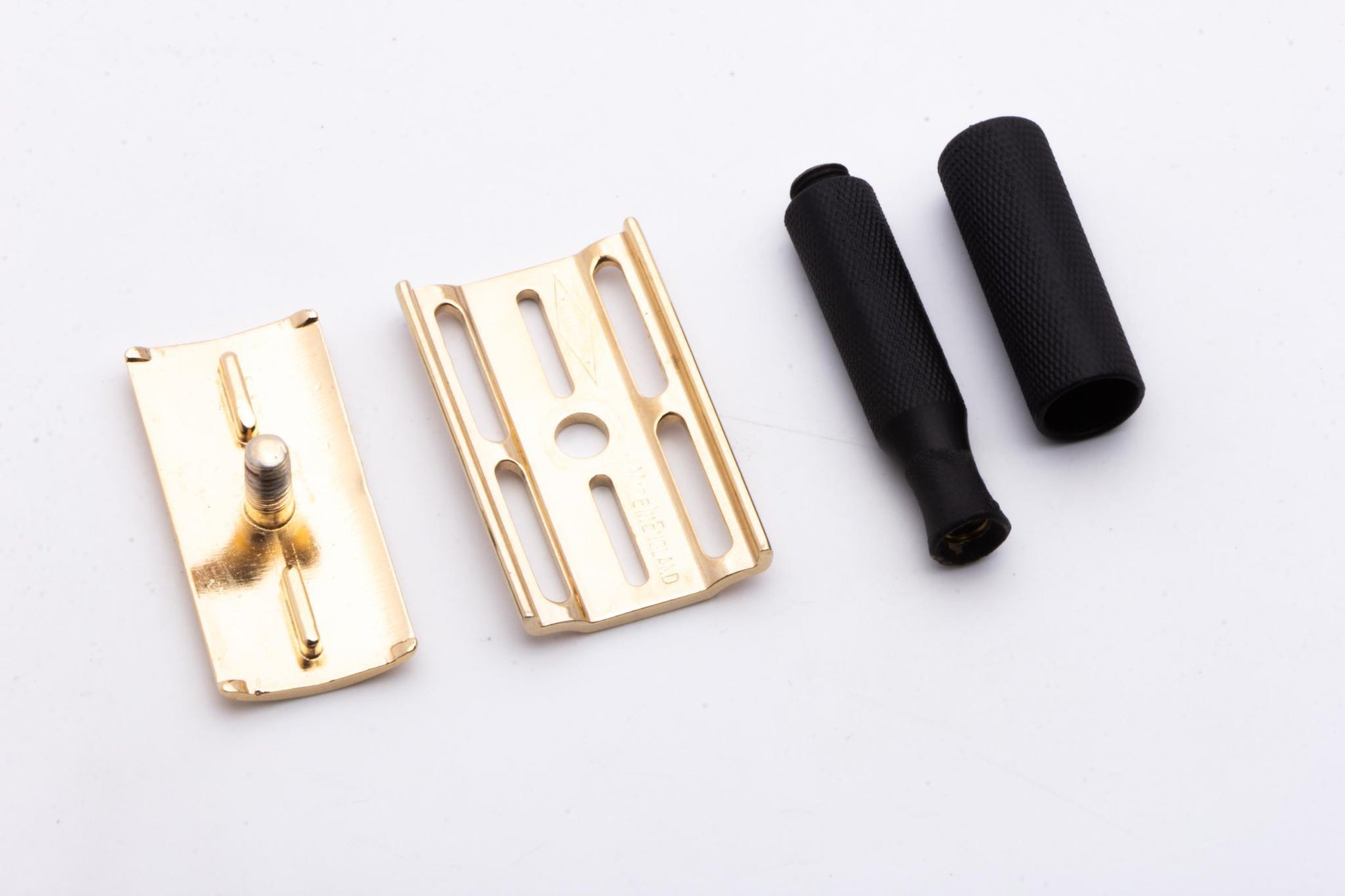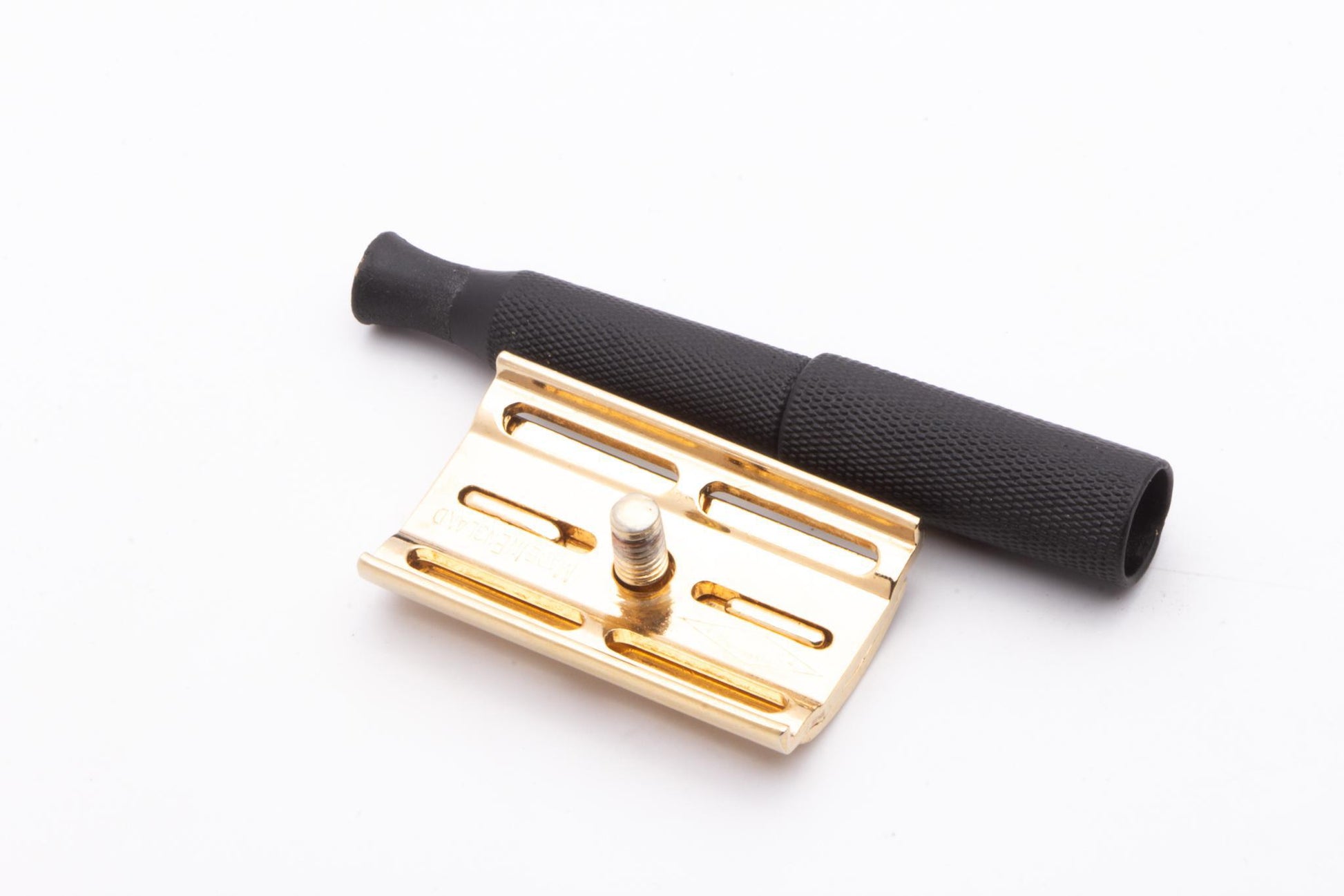 This is a unique Gillette Travel Razor. Made in Englad the razor can be deconstructed into a 2 peice handle with the guard and cap. Very easy to travel with. Sleek black and gold look will really bring something different to your shave den and collection.