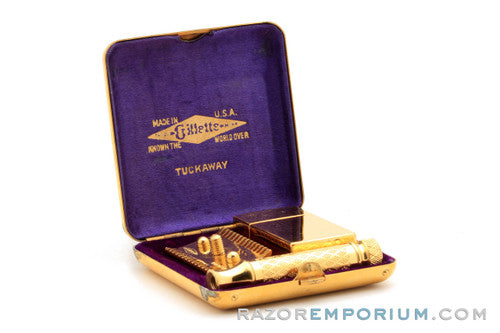 The perfect travel companion - the Gillette Tuckaway Travel set form the 1920's New Improved series of safety razors. This set is designated by the bar style head and short knurled handle. Features original gold plating in wonderful condition. Interior fabric is pristine. Highly collectible and a great shaver to boot! Comes complete with blade bank.
