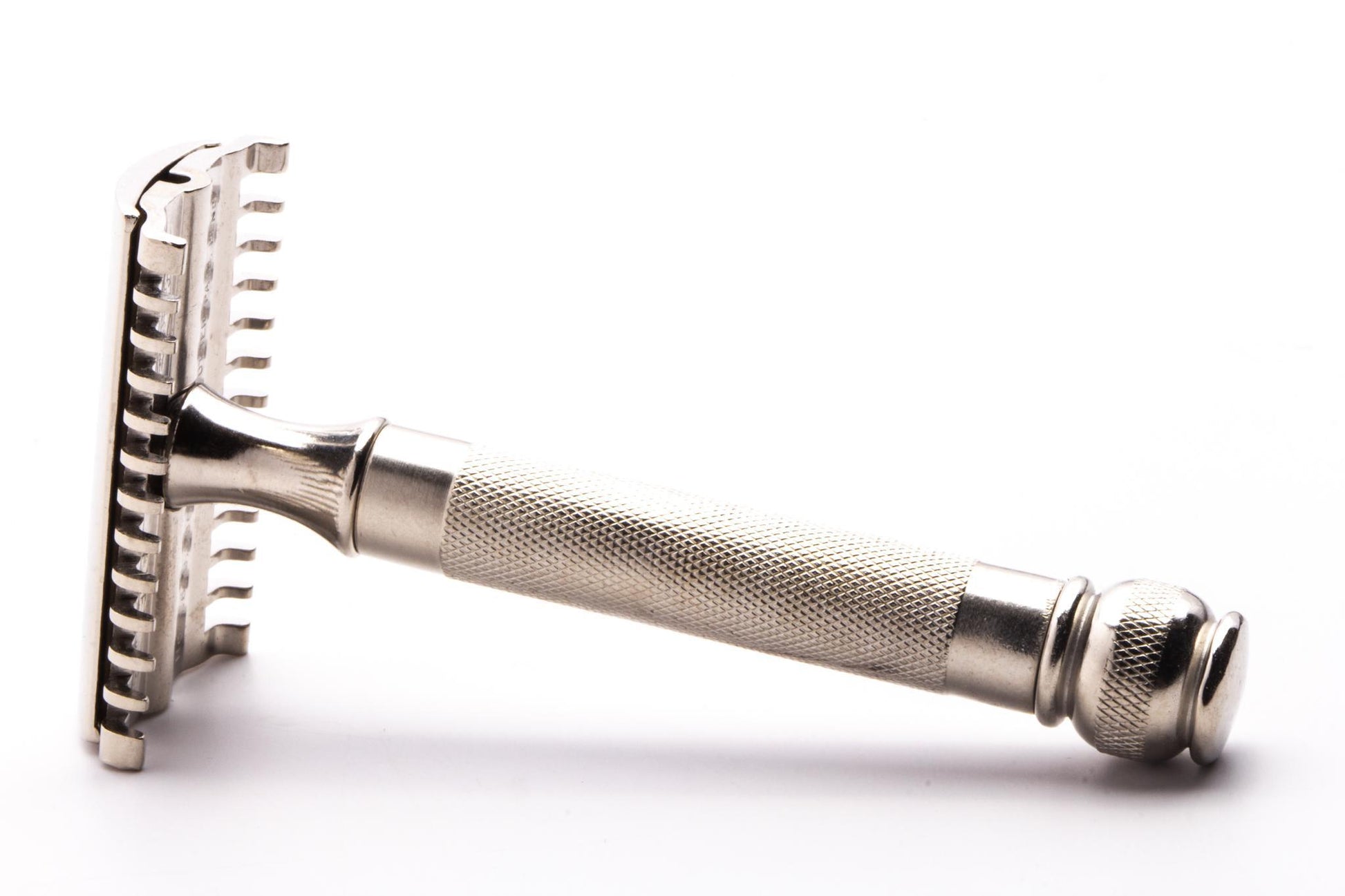 A wonderful old time razor, with medium to aggressive shaves and a gorgeous Factory Nickel shine! This razor features an original ball end handle.