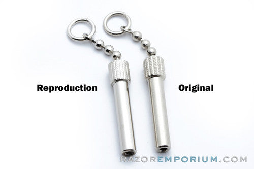 Most sets were sold 10 razors to 1 key, so now as rare as these razors are to find, the keys are 10 times rarer! The occasional replica has sprouted up over the years, always short lived, always cheaply made from hardware store parts and never looked authentic. And there is of course the screwdriver method. These are rare historical razors meant to be used and displayed and treasured. Screw-drivers have no place in a display case and they can damage the internal components of the razor.