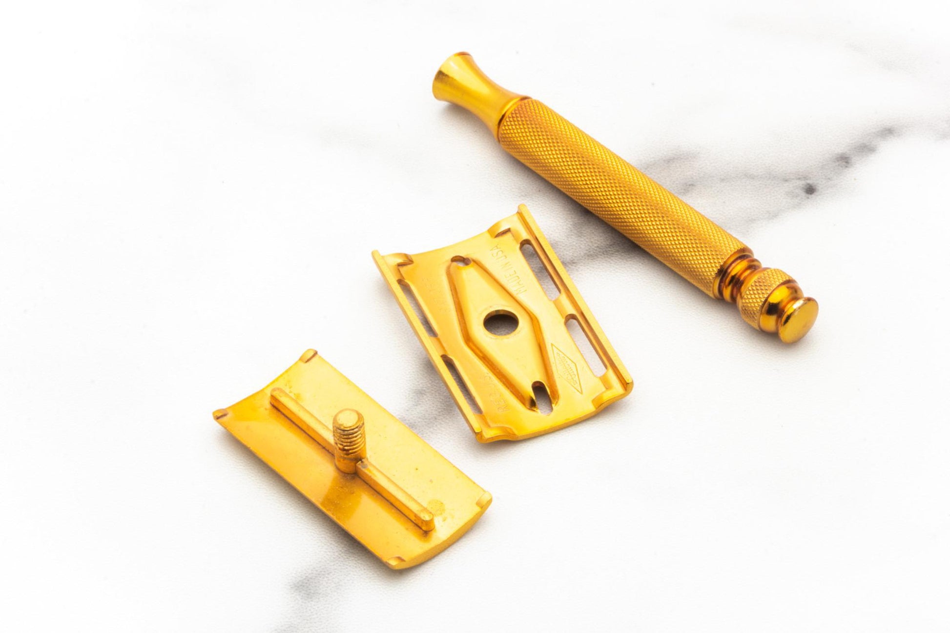 The razor retains its original Gillette gold plating, with natural wear on the cap that speaks to its age and history. The original red case also shows signs of previous use and wear, adding to the authentic vintage character of the set. Included are Gillette Blue Blades, completing the original offering and making this set both display-worthy and functional.
