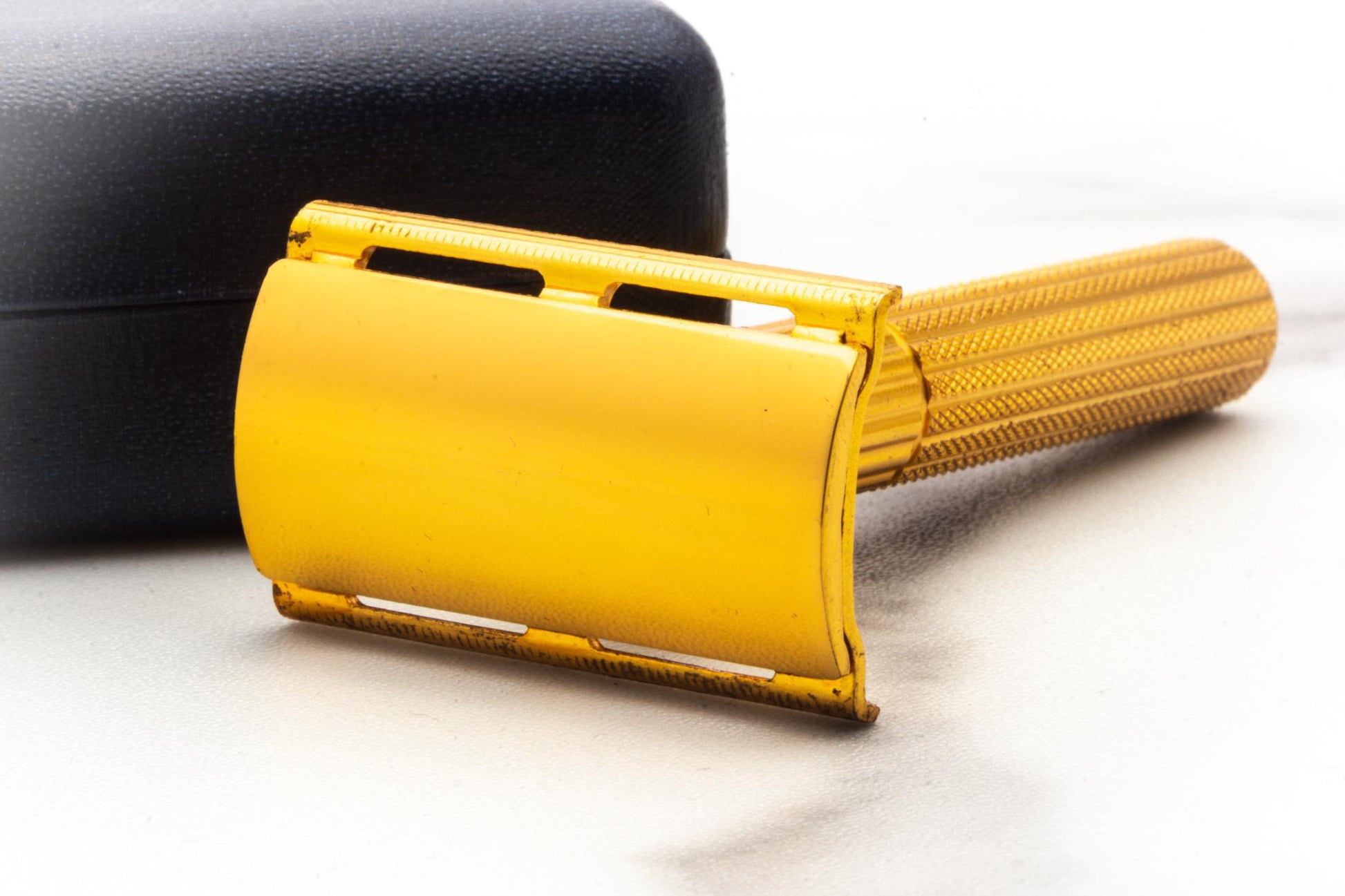 The razor comes in its original case, featuring a mint-condition felt interior and an outer material that has been remarkably well preserved over the decades. While the gold plating shows some natural aging, it adds character and authentic patina, reflecting the razor’s history rather than diminishing its appeal.