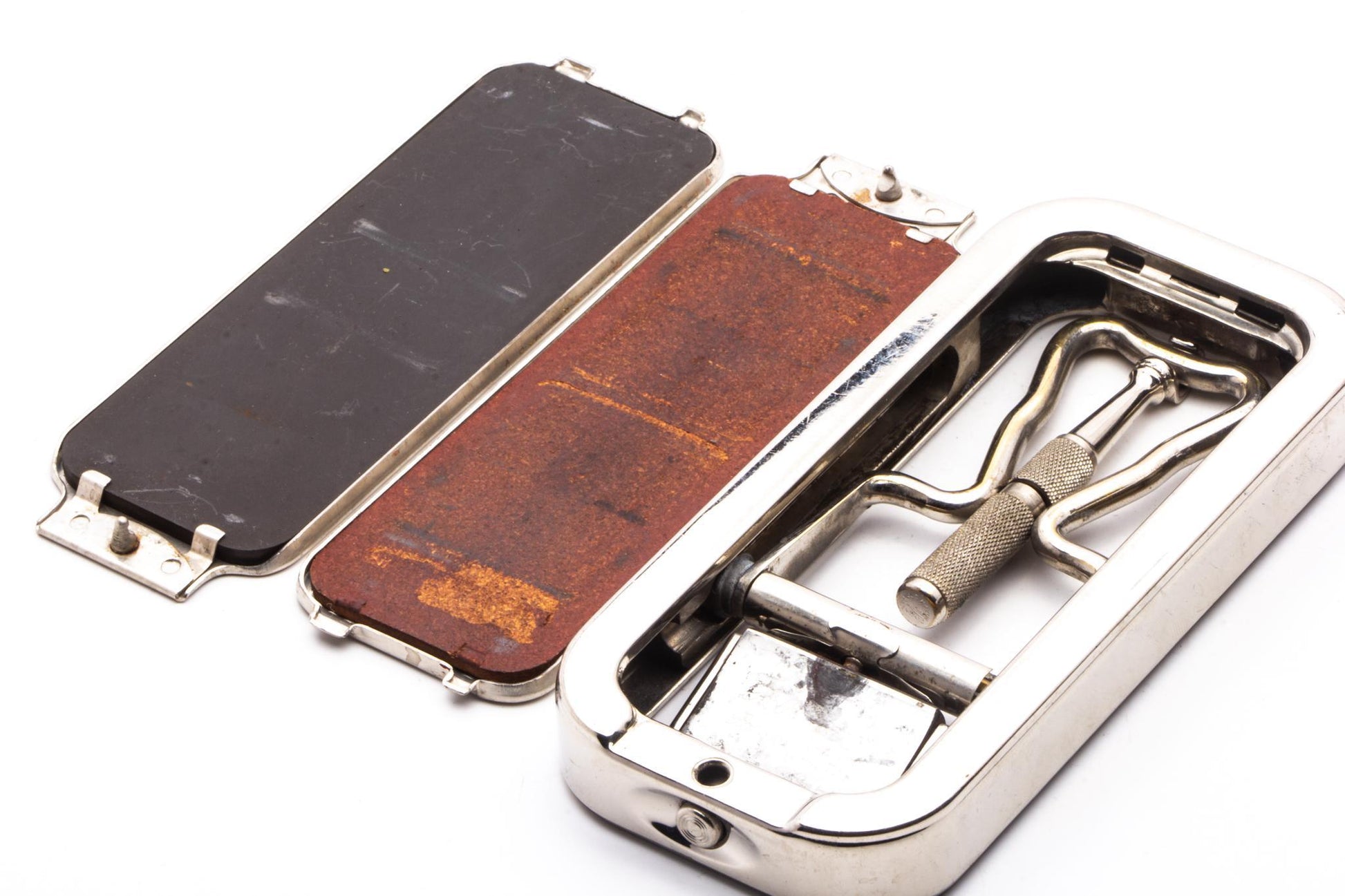 History: Rolls Razors were one of the last safety razors to use a blade that needed regular upkeep. They accomplished making it easier for the average shaver with a clever metal case that performed the stropping and honing in addition to serving as a storage device.