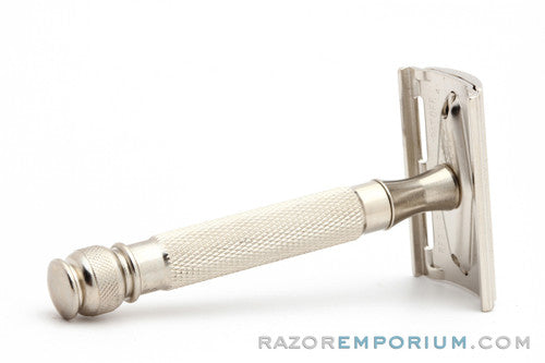 A beautiful mix/match razor featuring Gillette Revamped Tech head and balanced ball-end handle. The razor head has been professionally restored by our team of razor experts. The surface has been refinished and replated transforming this vintage item into a modern usable connection to history! The handle is modern made from solid brass and plated in nickel. These handles historically had cracks due to the press fitting. We have corrected this issue by threading the neck and ball into the handle rather than press-fitting. The threads have been thread-locked and will never crack. The head provides a smooth mild shave, and the finish is stain and scratch resistant!