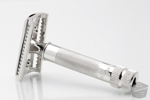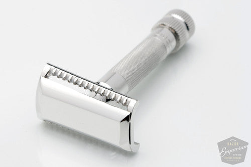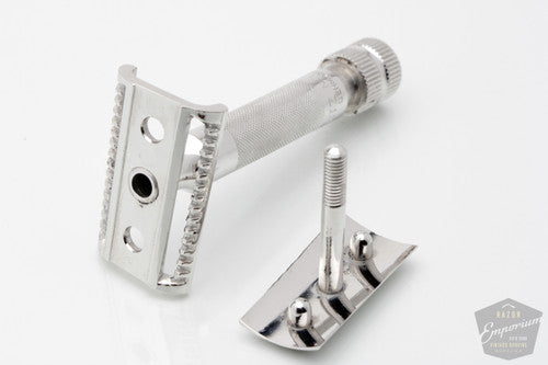 This razor has gone through our complete Revamp restoration process- including resurfacing, polishing, mechanical adjustment, plating, ultra-sonic cleaning painting of numbers, and lubrication. Razor has a solid weight in your hand, and handle knurling adds grip and control to your shave. Indulge with this precision shaving razor that you truly deserve!