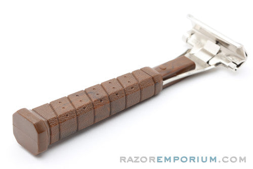 The Schick Injector is a classic razor that no shave den should be without, this is the hard to find Grip! A beautiful injector razor made to look and feel like a golf/tennis racquet handle. Some compare the feel of a stiff injector blade to a straight razor shave. This has a light weight feel in your hand, and could be comparred to a cartridge style shave technique wise.