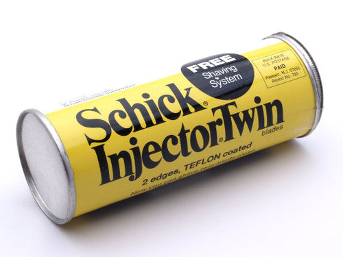 Available is the vintage New Old Stock Schick Injector Twin Blade Shaving System. This mailer is unopened and requires a can-opener to open. The inside are a bit of a mystery, we know there is a razor with shave ready injector. We suspect there is instructions, and a coupon for more blades. We anticipate this coupon is expired.