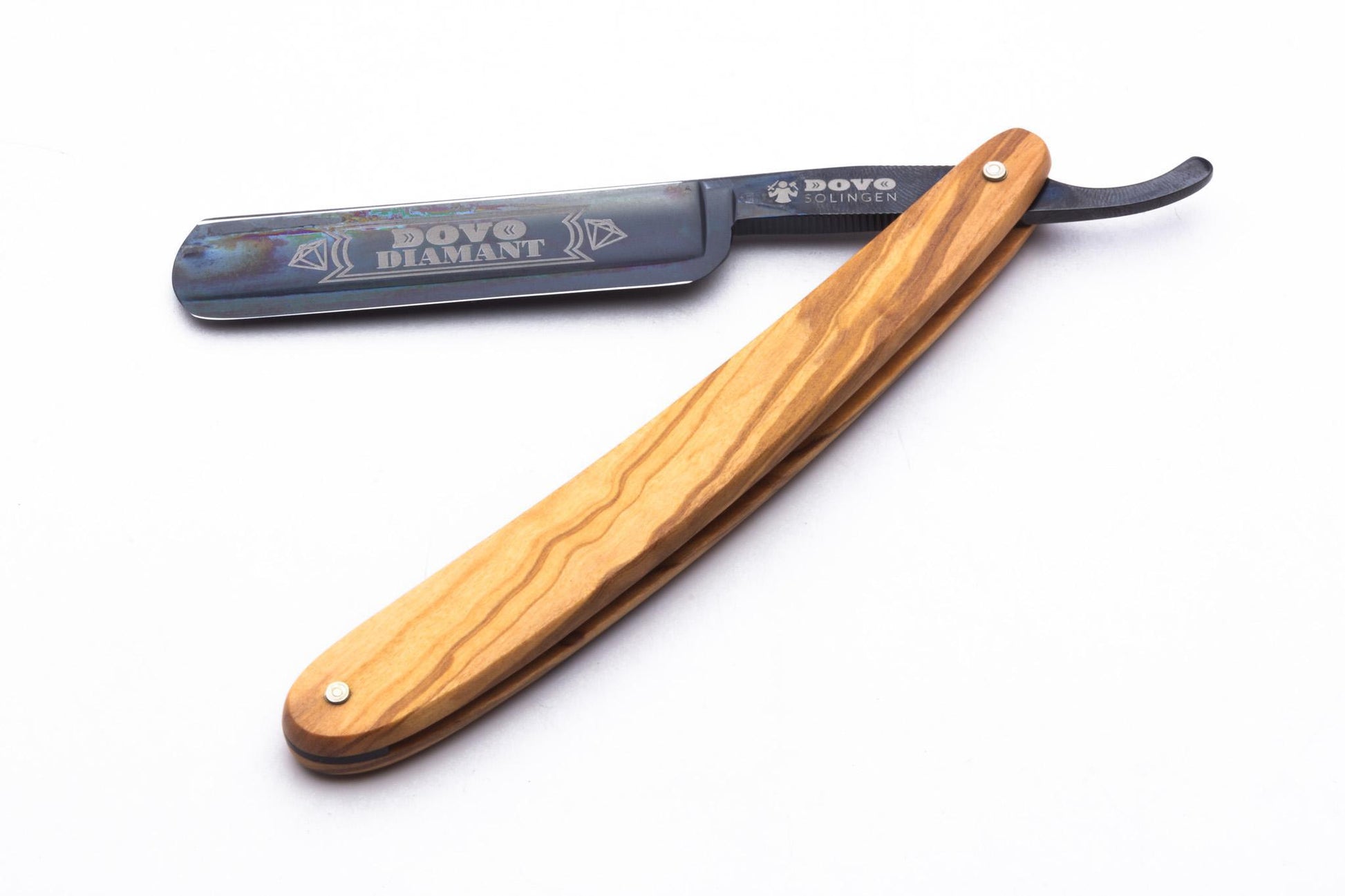 Experience the ultimate in grooming with the Dovo Solingen Diamant Black Blade Straight Razor. With its 5/8-inch blade made from the finest materials, this razor will deliver a clean, precise shave every time. The stylish black design is sure to make a statement in your collection. Order this striking razor and experience the difference a top-quality DOVO can make. This straight razor would be perfect for a beginner due to its round tip, hollow ground, and and will last several lifetimes! This striking black carbon steel blade features gorgeous 24K gold etching and beautiful wooden scales.