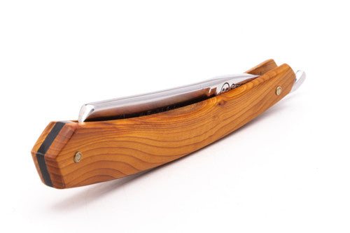 This straight razor is new and comes 100% Shave Ready from Ertan himself. No need to strop when it arrives, just enjoy the shave! Comes with packaging and leather sheath for storage and travel. Leef wood scales are beautiful and the 5/8" blade will last for lifetimes to come. See why so many are collecting the Ertan Süer razors before the demand for these incredible straight razors gets over-whelming!