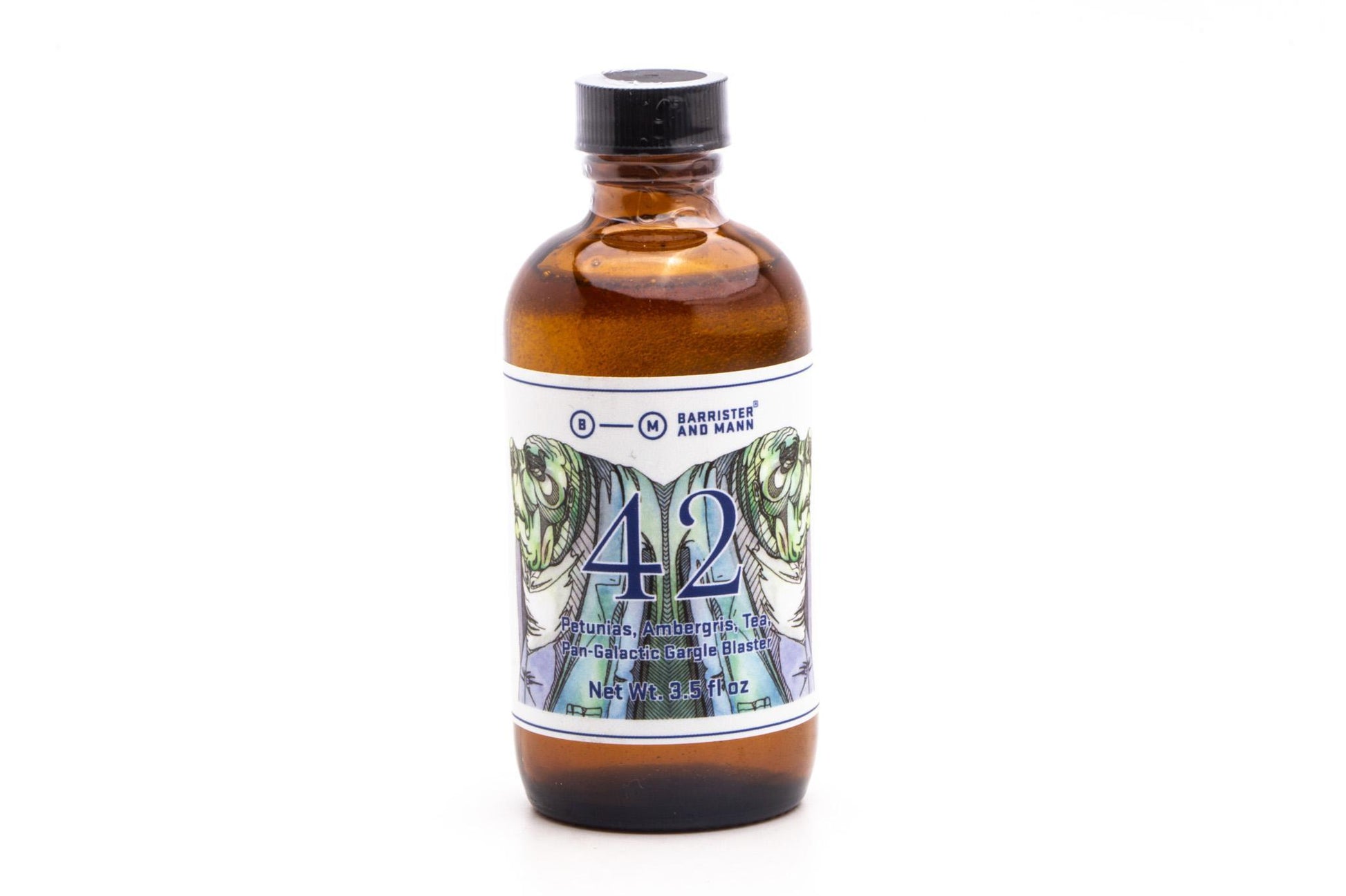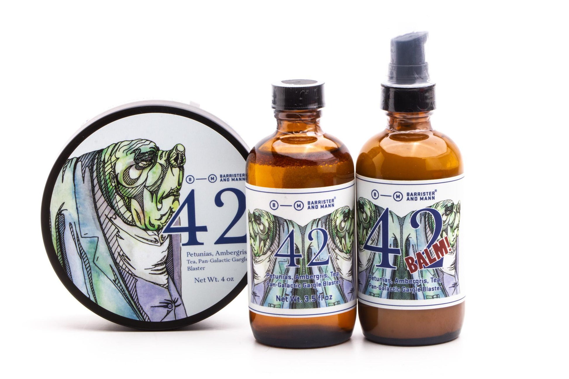 For Towel Day, the commemoration of Douglas Adams’ authorship of The Hitchhiker’s Guide to the Galaxy, Barrister and Mann presents our tribute to his brilliant work: 42, a soap that smells of petunias, ambergris, tea, and Pan-Galactic Gargle Blaster (lemon sugar). Grab a copy of the Guide, a cup of tea, and your shaving brush; it’s going to be a hell of a ride.
