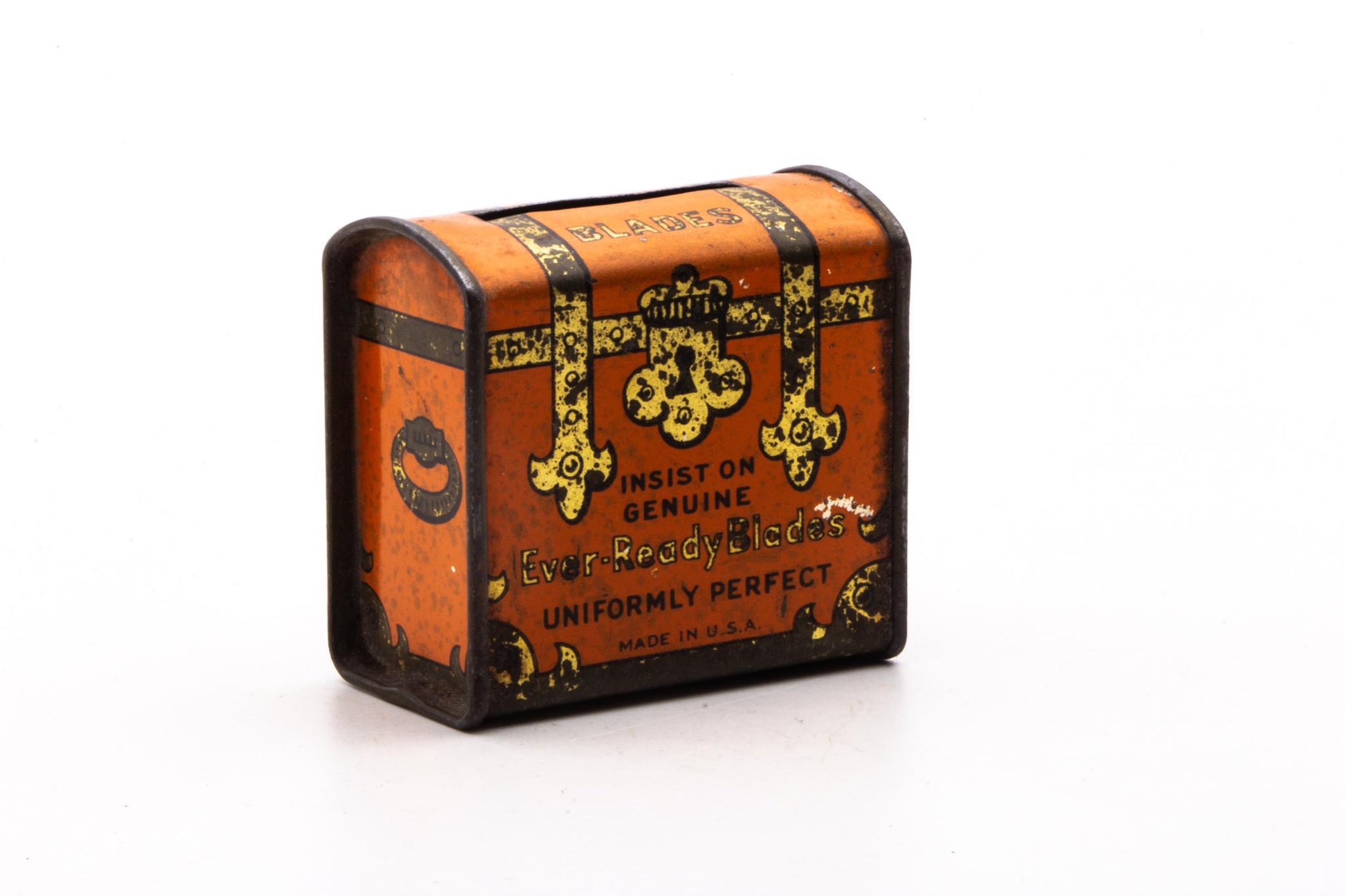 Available is a tin blade safe in the shape of a steamer trunk. Ideal for holding your used razor blades safely in a convenient, small, and safe place. After all, it is NOT safe to put your used blades right into the trash can. Perfect solution to an age old problem!