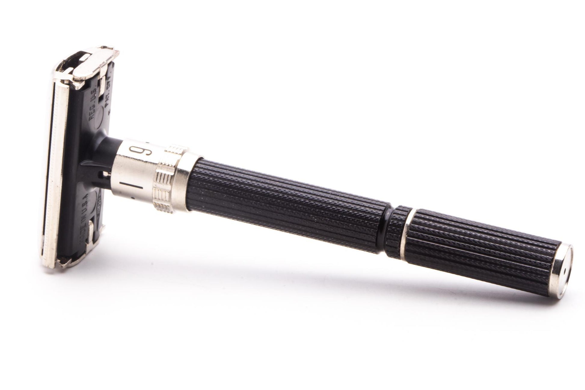 For those who prefer a long handle and adjustable shave, look no further than the Gillette "Black Beauty!" This razor features a brass head with factory nickel plating and aluminum handle. Wet-shavers world-wide respect the quality and popularity of this renowned adjustable razor. The adjuster works very easy, and spins from 1-9, changing the amount of blade gap exposed during your shave. The higher the number, the bigger the blade gap (thus more aggressive of a shave), the smaller the gap (more mild shaves).