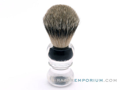 This restored vintage brush has been restored and re-knotted with the softest and most luxurious manchurian silver tip badger hair, giving the brush a soft and comfortable feeling during use. The clear handle gives it a natural flair that is sure to compliment your shaving collection.