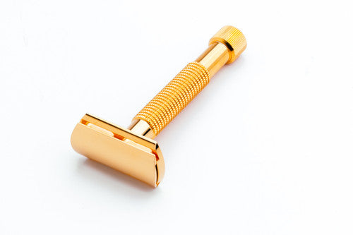 - DeLuxe G: Polished and plated in hard acid 24K Gold to allow the gold’s deep yellow color to sparkle and more durable gold finish. 24K Gold is the purest form of Au at 99.9%. Cleaning of the razor would be similar to any gold jewelry; best carried out by a professional or specialized Gold cleaning products.