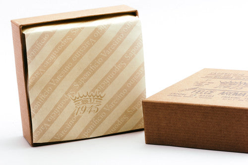Our artisan shaving soap is worked on a extruding machine and the hand-cut to our 90mm specification and then the SV 1945 crown logo is hammered into the soap as it was done at the beginning of the last century before the advent of printing machines.