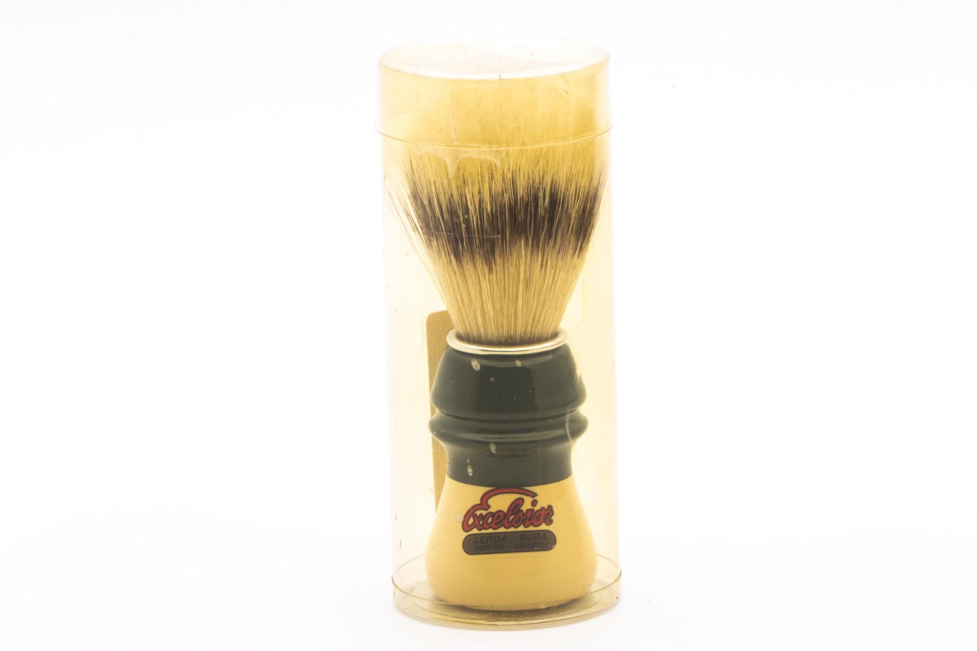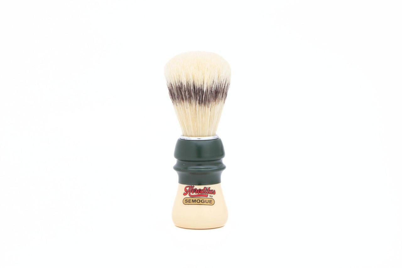 The handle brings back memories of decades past with its two-toned painted wood handle: green and cream. It also boasts the Semogue logo and Excelsior Cerda Pura. Check out this economical and effective shaving brush option from Semogue.