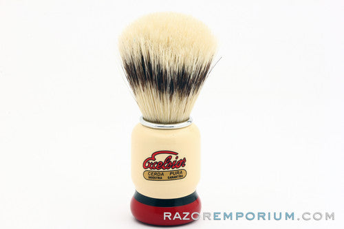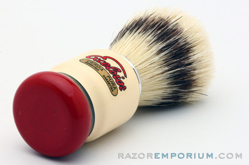 This brush is loaded with Semogue's banded pure boar bristles. Boar is known for its stiffness - great for those seeking exfoliation and the "scritchy" feeling on your face. It is also an effective latherer, whipping up mounds of white froth. It is great on creams or soaps. This brush will soften over time to give you softer bristles - rather like wearing in a nice pair of leather shoes.