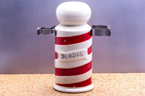 This is a super cool vintage barberpole peice that will be a great collection to your shave den. This will take a brush on one side, razor on the other and blades in the middle.
